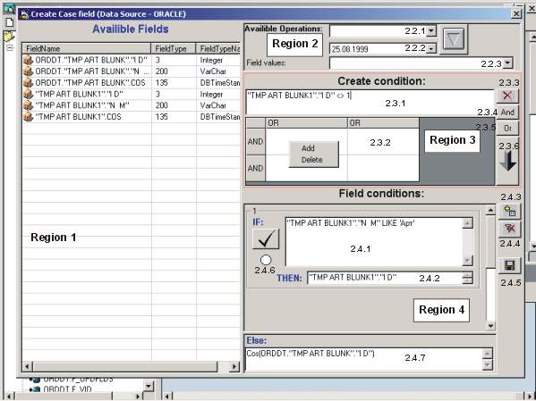 - Variants of filling of a field (Region 4) - finishing stroke in work on creation of a field with conditions. The button 2.3.6 adds in 2.4.1 the generated condition "IF" (see example). The value of a field at performance of a condition is brought in 2.4.2. The button 2.4.3 adds a new condition IF … THEN … i.e. practically creates one more block (2.4.2 and 2.4.3). The button 2.4.4 deletes a condition IF … THEN … if on it there is a focus. The button 2.4.5 keeps a field with a condition in query, previously having checked up all generated conditions. If any of conditions is incorrect, the semaphore of a field (2.4.6) will have red color. If the design is correct - green.