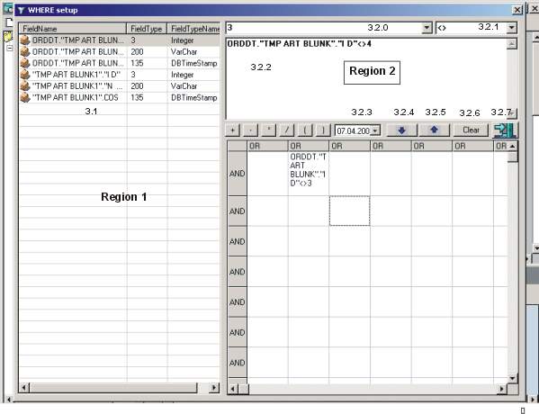 For creation of conditions in query on the main form (Pic.1) press the button (11). The open form (Pic.3) has the title "Make the filter" and contains some areas: