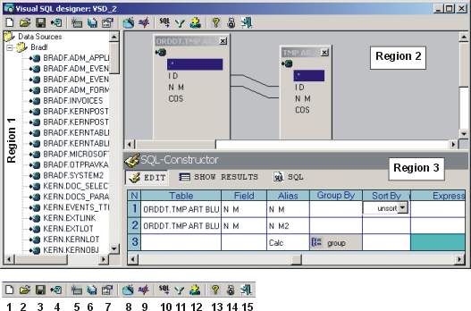 - "Accessible fields" (Region 1) - list of all fields of the tables in query.